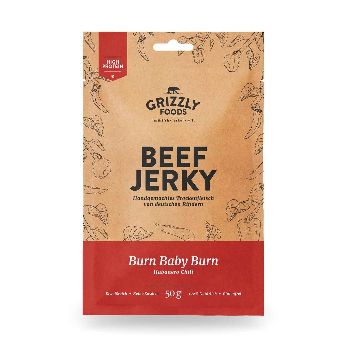Beef Jerky Burn Baby Burn 50g. Koostisosad: Veiseliha, SOJAKASTE (vesi, SOJAOAD, sool, piiritusäädikas), õunasiidri äädikas, tšilli, paprika, sibul, küüslauk, pipar, habanero tšilli, pöögi suits. Märkus: 100 g Beef Jerky valmistamiseks on kasutatud 310 g värsket veiseliha. Toitumisalane teave 100 g kohta: Energiasisaldus: 1480 kJ / 351 kcal Rasvad: 9,8 g