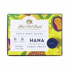 852330005008 Kommid Maui Fruit Jewels Exotic Fruit Jellies Hana Collection of Hawaii Fruits 43g. Koostisosad: Hawaii puuviljade viljaliha (banaan, guajaav, granadill (koos jahvatatud seemnetega), mango, papaia, ananass); roosuhkur, glükoos, tardaine: pektiin, vesi, happesuse regulaator: sidrunhape, antioksüdant: askorbiinhape. Võib sisaldada piima, muna, kala, koorikloomade, sarapuupähklite, maapähklite, nisu, soja ja seesami jääke.Toitumisalane teave 100g. kohta. Energiasisaldus: 1340kJ / 320kcal, rasvad <0,5g, millest küllastunud rasvhappeid 0g, süsivesikud 80g, millest suhkruid 63g, valgud <1g, sool <0,1g. Parim enne formaadis KK-PP-AA ja partii tähis trükitud pakendile. Säilitada kuivas ja jahedas. Toodetud USAs. Importija: Experienso OÜ Aleksandri 13 Tartu