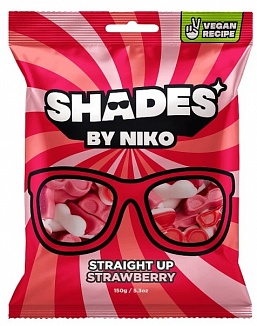 SHADES BY NIKO STRAIGHT UP STRAWBERRY (150 g) Maasikamaitselised närimiskommid. Koostisosad: glükoosisiirup, suhkur, modifitseeritud tärklis, dekstroos, happesuse regulaatorid: sidrunhape (E330), õunhape (E296), piimhape (E270); kartulivalk, lõhna- ja maitseained, värvivad puu- ja köögiviljakontsentraadid (must porgand, redis, õun, mustsõstar), hüdrolüüsitud hernevalk, päevalilleõli, glasuuriaine: karnaubavaha (E903). VÕIB SISALDADA PIIMA JÄLGI. TOITUMISALANE TEAVE 100 g KOHTA: Energia: 1460 kJ / 349 kcal Rasvad: 0,5 g millest küllastunud rasvhapped: 0,1 g Süsivesikud: 85 g millest suhkrud: 61 g Valgud: 0,6 g Sool: 0,1 g