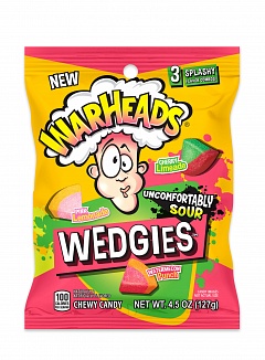 032134285039 Nätsukommid hapud Wedgies 127g. Koostisosad: suhkur, glükoosisiirup, dekstroos, modifitseeritud maisitärklis, maisitärklis, happesuse regulaatorid: E330, E270, E296, E297, E331, lõhna- ja maitseained, värvained (E129*, E102*, E110*, E133). Toitumisalane teave 100g kohta. Energiasisaldus 1396 kj/333kcal, rasvad 0g, millest küllastunud rasvhapped 0g, süsivesikud 86,67g, millest: suhkur 60g, valgud 0g, sool 0,08g. Hoiatus! * võib avaldada kahjulikku